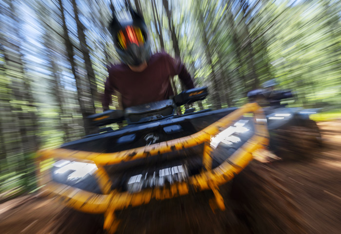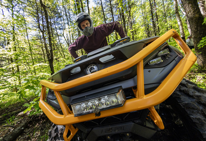 Equipado com amortecedores dianteiros e traseiro Fox 1.5 Podium QS3, direção dinâmica assistida de modo triplo (DPS), guincho com capacidade para 1.588 kg (3.500 lb), diferencial dianteiro autoblocante Visco-4Lok, para-choques dianteiros e traseiros reforçados, rodas de alumínio fundido de 14 polegadas com pneus Maxxis Bighorn 2.0 de 27 polegadas, defletores de vento no guidão, mostrador digital multifunção de 7,6 polegadas e muito mais.